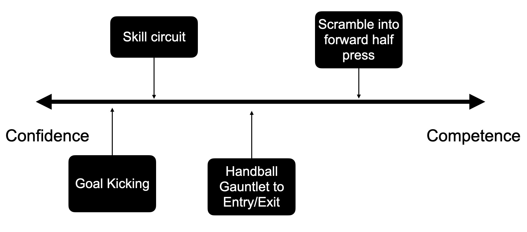 So, within this session we have a mix of higher repetition of skills for our performance/confidence focus in the skill circuit and handball gauntlet, followed by a more unpredictable and challenging/competence activity focusing on learning in the scramble to forward half press, finished by a relatively repetitive goal kicking activity. This last activity can be manipulated to make it easier if a higher level of confidence is desired. It could be athlete led too, where they’ll likely perform a highly repetitive drill. This is visually reflected on the confidence-competence continuum below (Figure 1).
