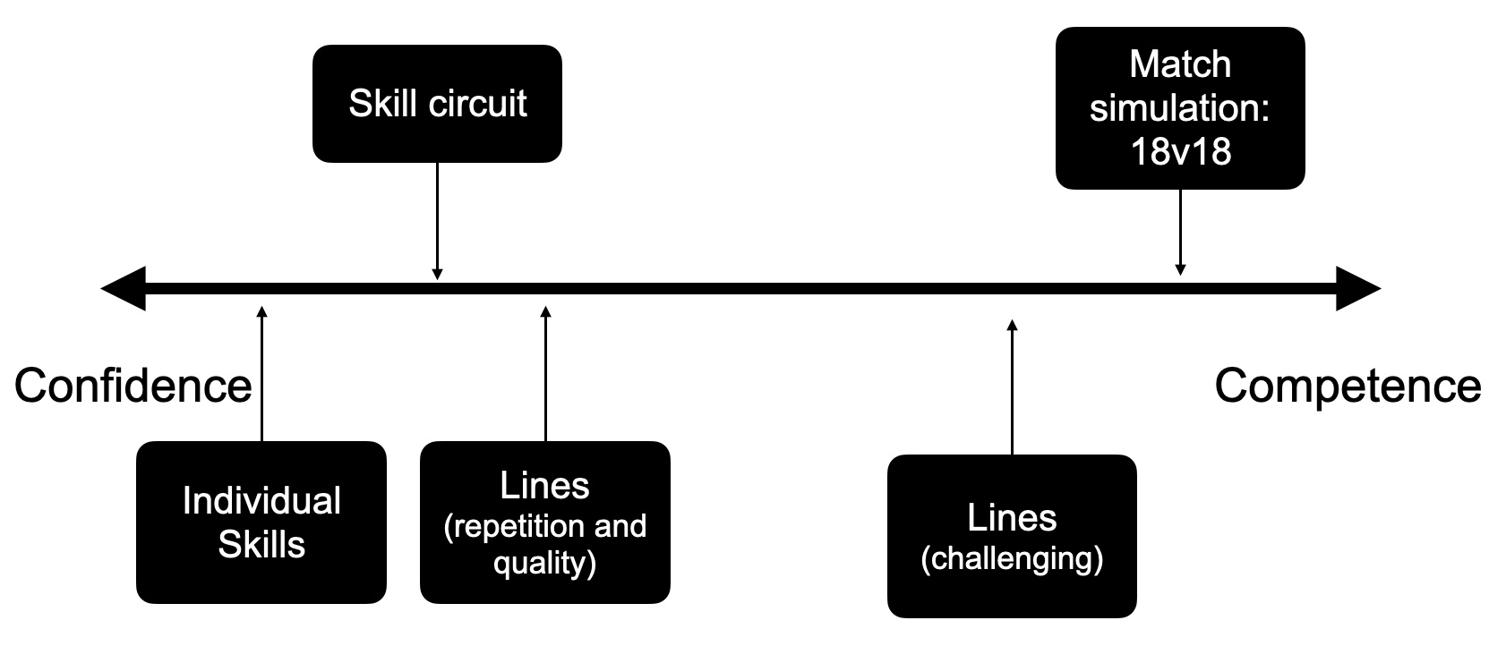 This session begins with a repetitive, performance/confidence focused activity with the skill circuit. We then have our most similar activity to competitive performance, with high amounts of unpredictability and complexity in match simulation. Skill executions and movements are random based on teammates and opposition positioning, where the ball is etc. The lines (challenging) entails a more dynamic but important part of each positional groups role and can be fast-paced, dynamic and challenging, hence, more competence-based. We would expect errors to be higher here, so learning is higher. Conversely, the Lines (repetition and quality) would remove key informational sources and should have a decrease in intensity and velocity of movements and executions. So, errors would be significantly lower resulting in higher performance and higher confidence. This is especially important finishing the session. Lastly, individual skills can be highly repetitive and only include 1-2 key skills such as short range kicks, overhead marks or groundballs. This is visually reflected on the confidence-competence continuum below (Figure 2).