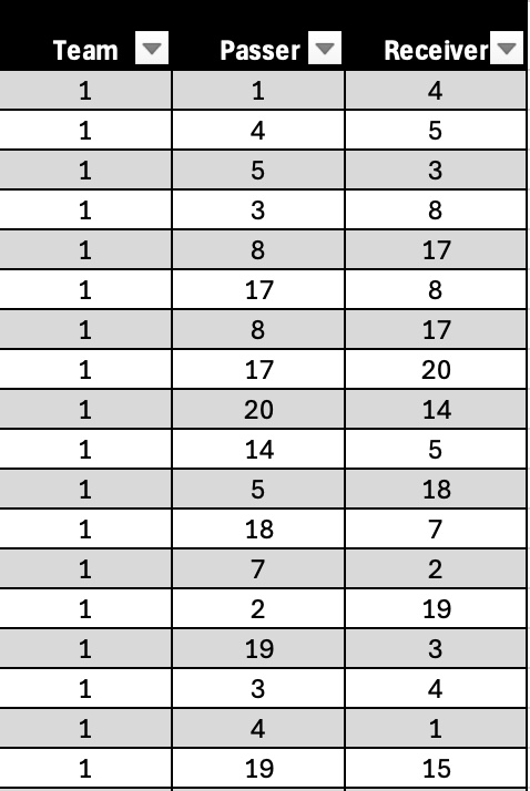 Once we have collected our pass-by-pass data using the excel template provided, we can import our adjacency matrix into R. From there, we can create a number of social network metrics that reflect different passing behaviours in our team and visualise these behaviours to create an appealing and informative visual to help assess individual and team performance. This could inform decision-making on things such as player and team reviews, tactical strategy, longitudinal player and team development and opposition tactics and behaviours, to name a few.