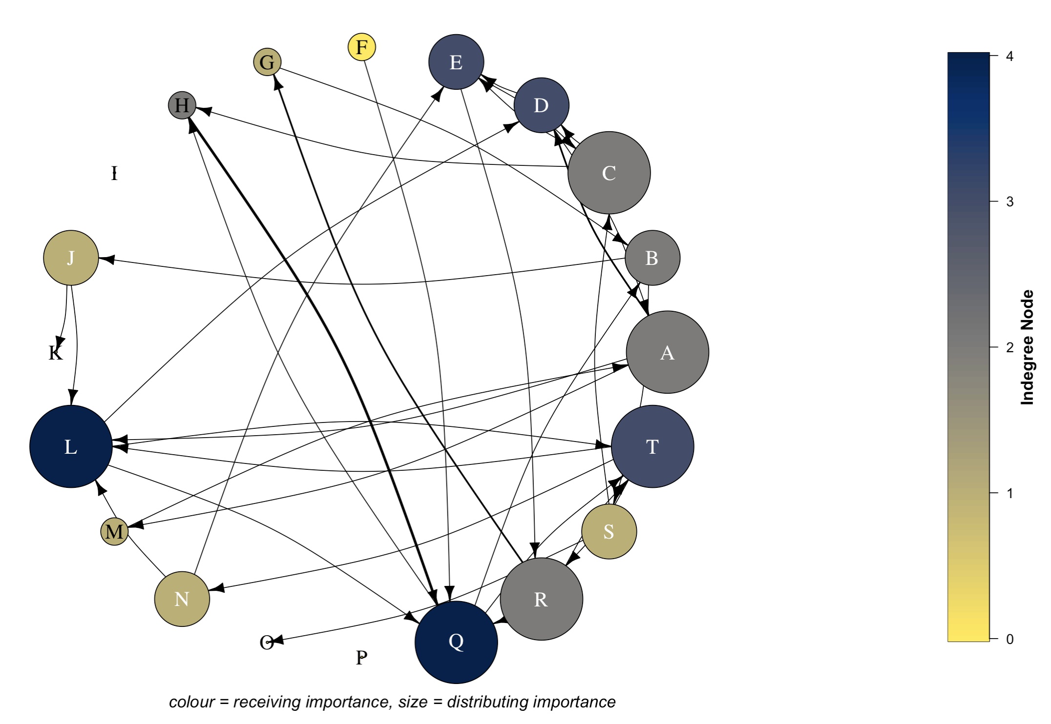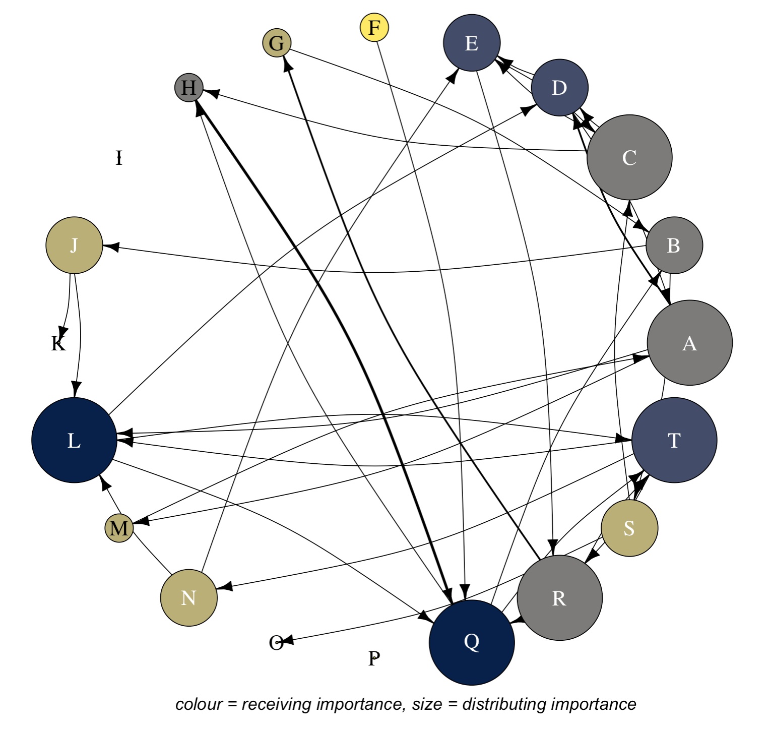text(0.1, -1.15, "colour = receiving importance, size = distributing importance", font = 3, cex = 1.2)