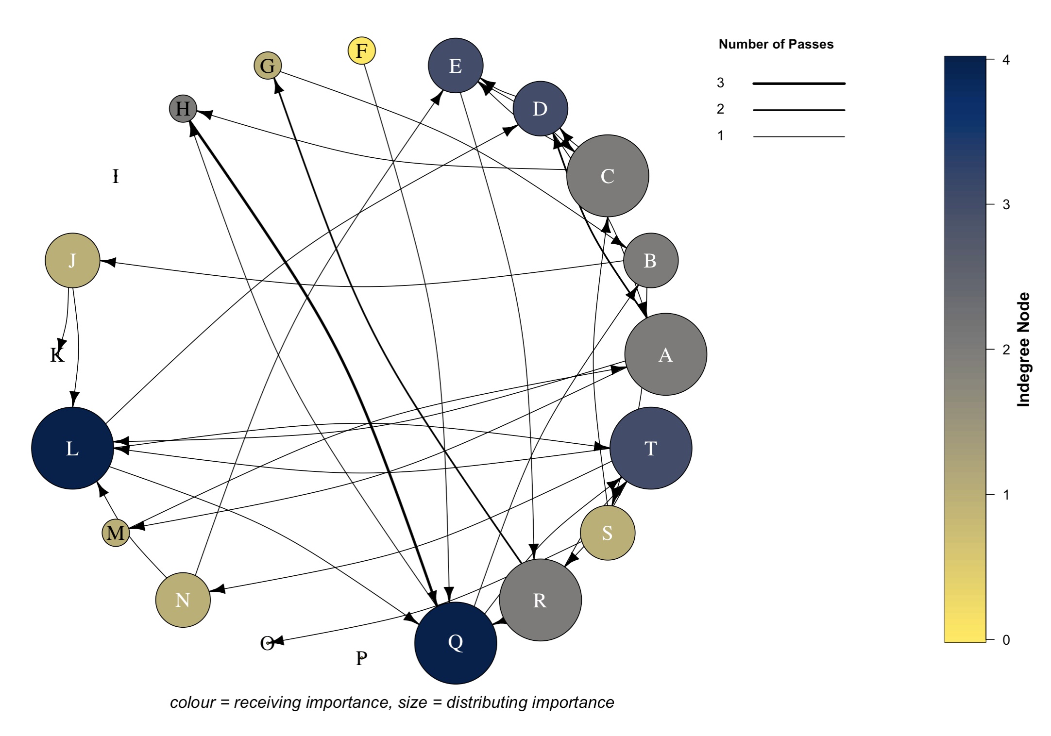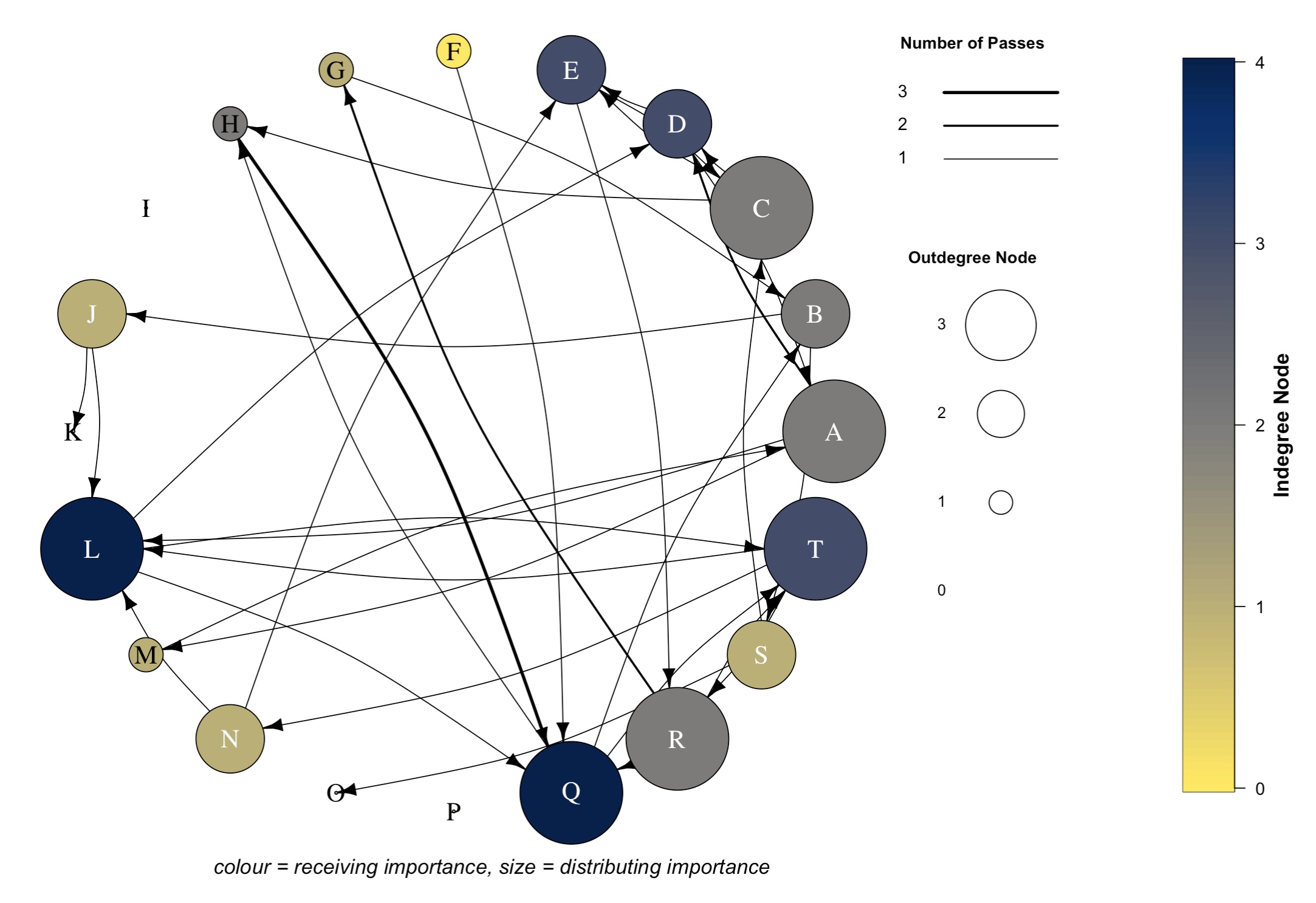 Darker nodes indicate a player has a greater level of receiving importance. Node colour represents indegree node values (i.e. number of players that each player has received passes from).