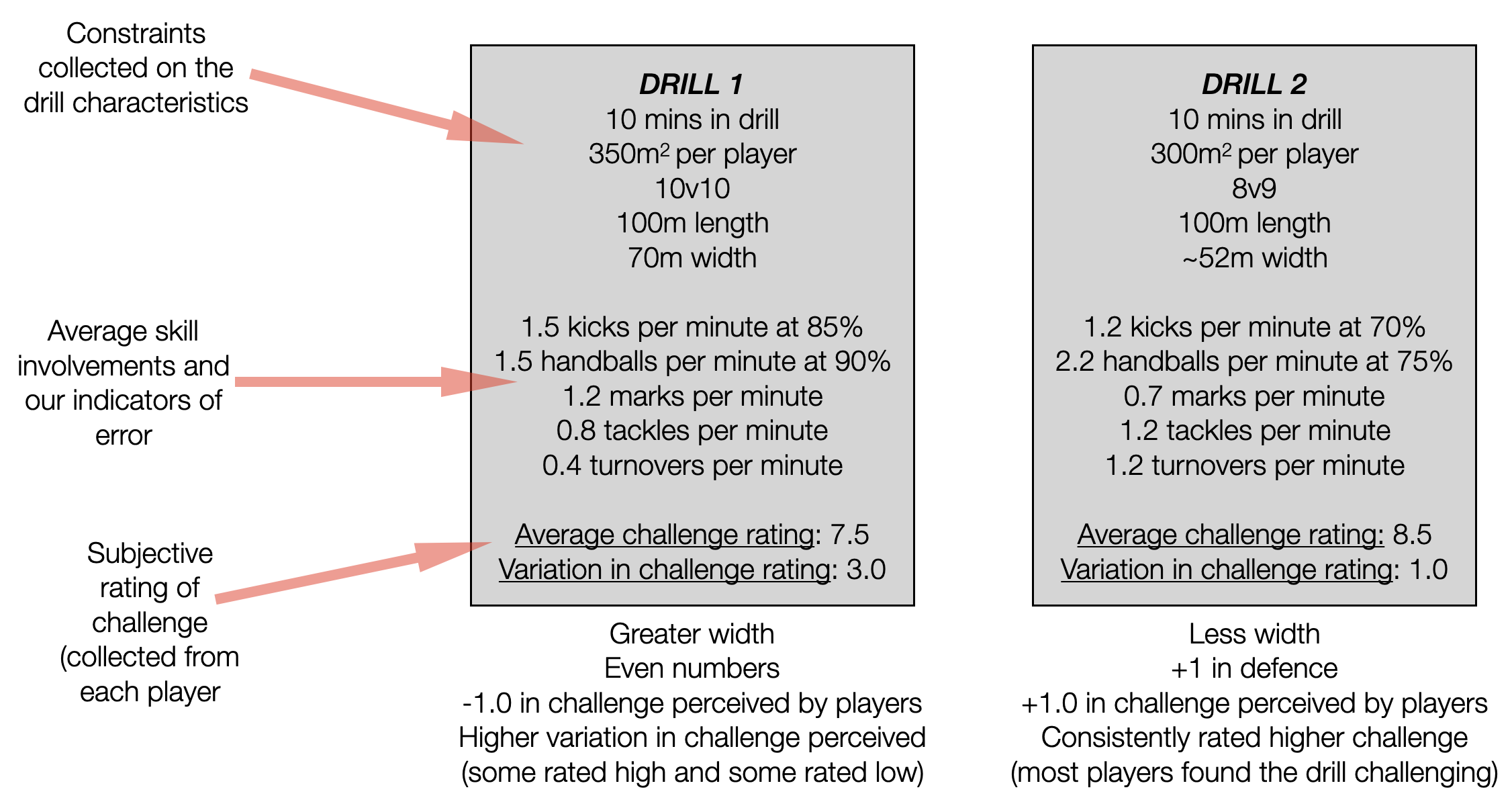 We will approach this by using a more holistic measurement of the level of challenge that incorporates measures of errors and importantly, in a way that we can systematically monitor and manipulate training. This will be done to understand which drills are more difficult based on player perception and how this interacts with the constraints implemented in different drill types and how their skilled behaviour changes as a result. The method would be as follows: